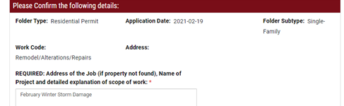 - For us to prioritize your permit for review, please mention “February Winter Storm Damage” in the required description field.